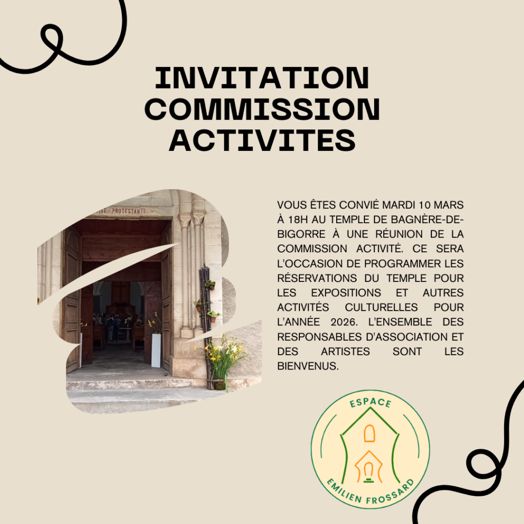 Vous êtes convié Mardi 10 mars à 18h au temple de Bagnère-de-Bigorre à une réunion de la Commission Activité. Ce sera l’occasion de programmer les réservations du temple pour les expositions et autres activités culturelles pour l’année 2026. L’ensemble des responsables d’association et des artistes sont les bienvenus.