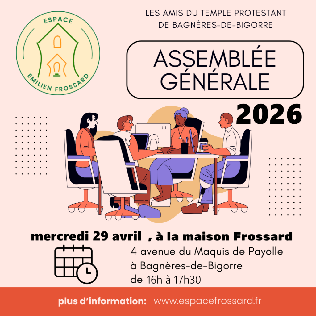 L’assemblée générale ordinaire des amis du temple protestant de Bagnères-de-Bigorre est convoquée le 29 avril 2026 à 16h à la Maison Frossard, 4 avenue du Maquis de Payolle. Nous terminerons à 17h30, afin de pouvoir assister à la conférence à 18h à l’Espace Maintenon.
